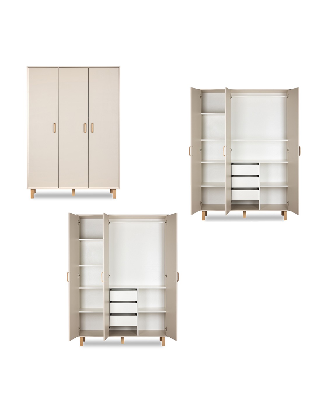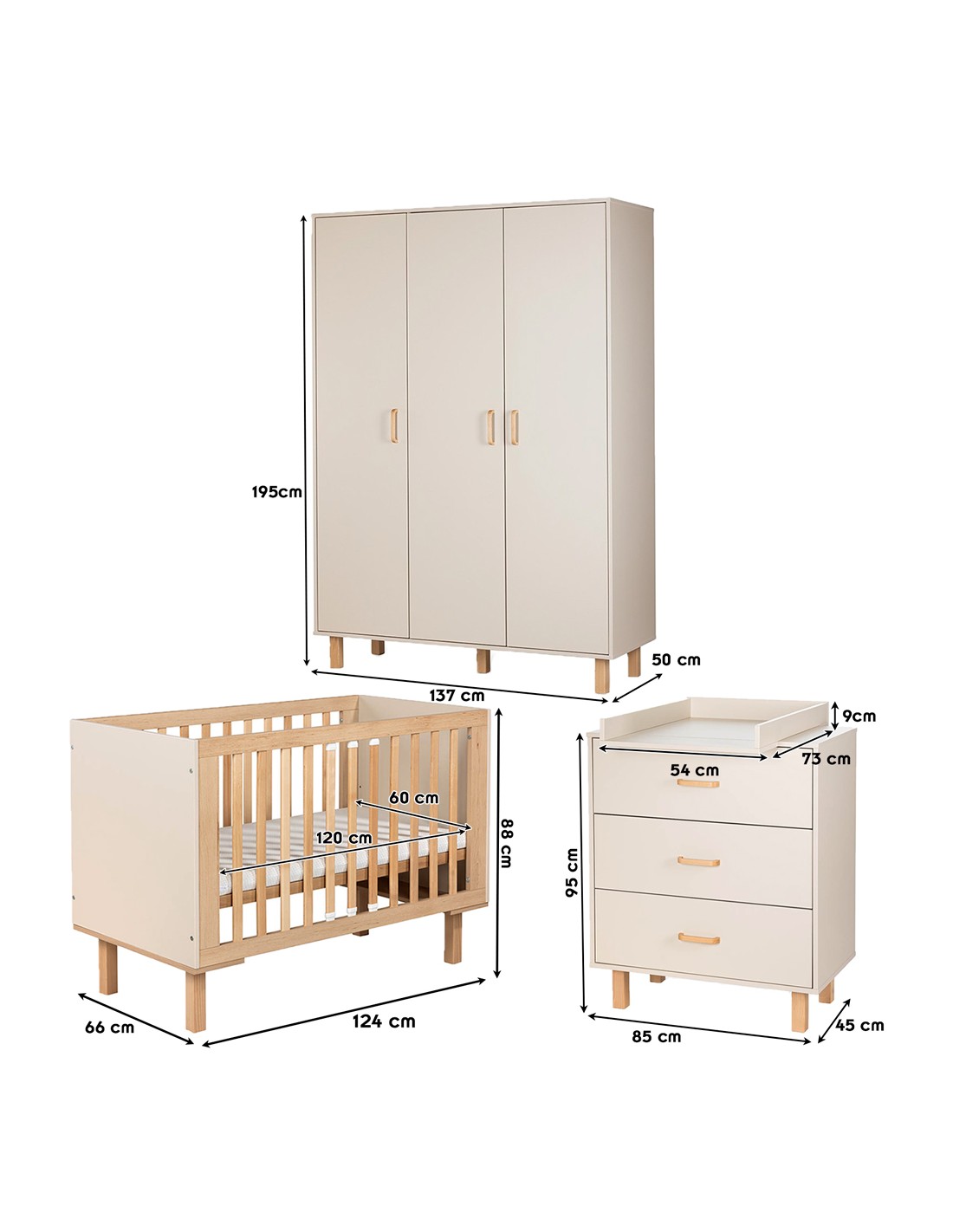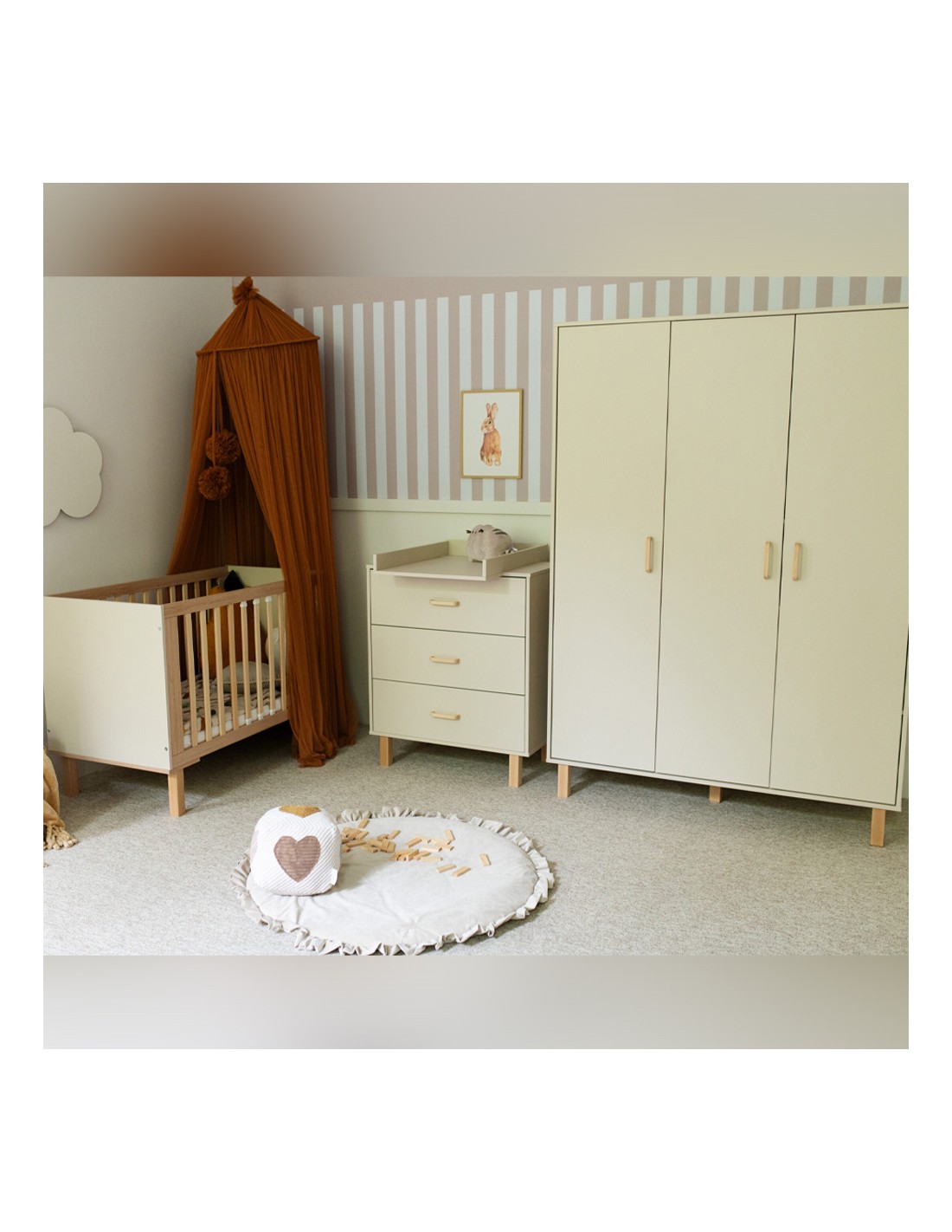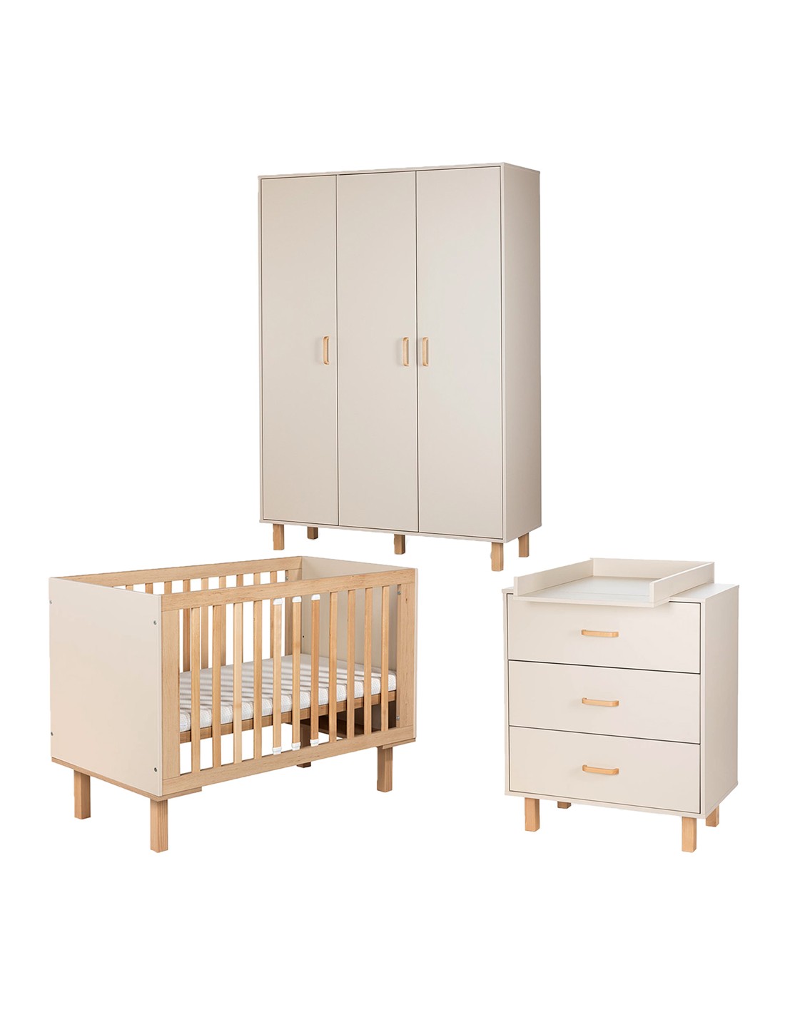 Cet ensemble est composé d’un lit à barreaux, d’une commode et d'une armoire. Un plan à langer amovible pour le lit ou la commode est disponible, au choix.