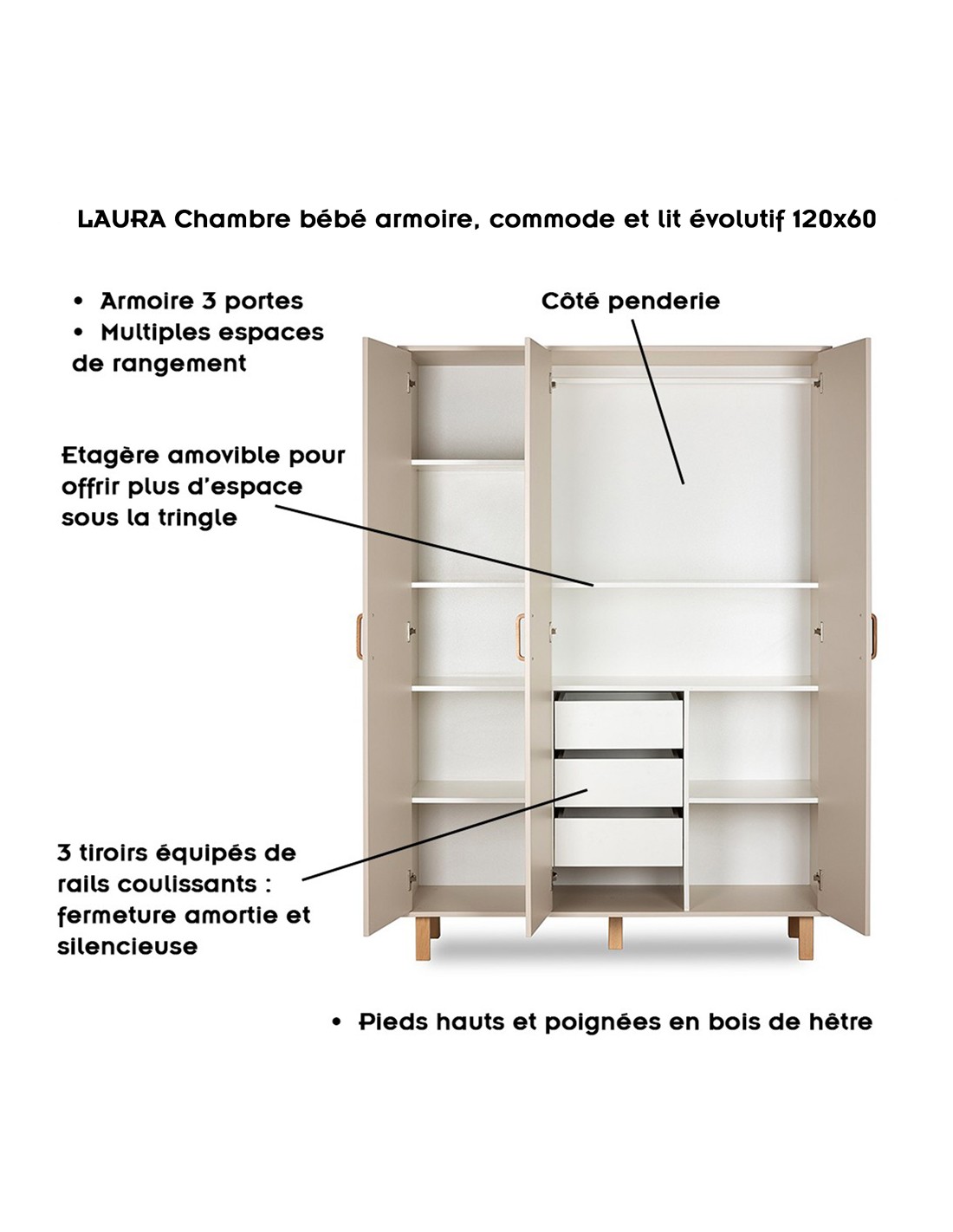 LAURA Chambre bébé armoire commode et lit évolutif 120x60 Champagne