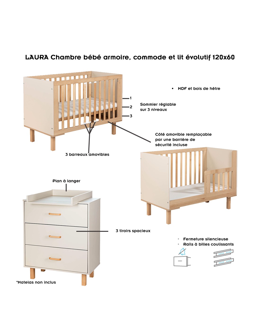 LAURA Ensemble bébé commode et lit évolutif 120x60