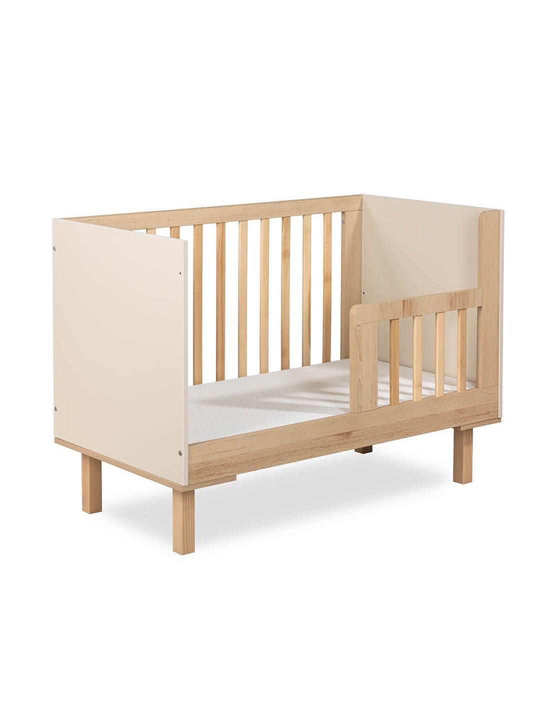 Le sommier à lattes est réglable sur 3 niveaux. Un des côtés du lit peut se remplacer par une barrière anti-chutes.