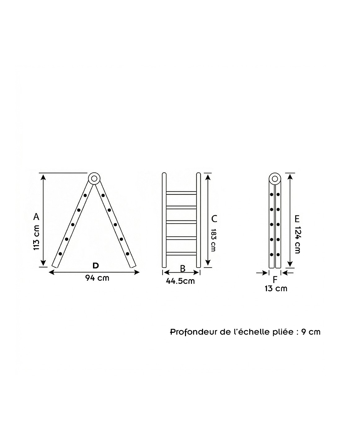 3 marches : A : 113 cm / B : 44,5 cm / C : 123 cm / D : 94 cm / E : 124 cm / F : 13 cm. Poids : 4,4 kg.