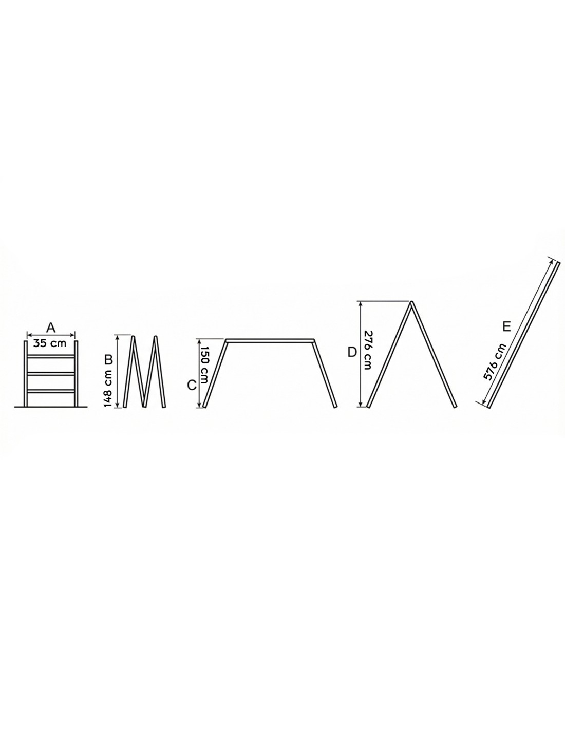 5 Marches : A : 35 cm / B : 148 cm / C : 150 cm / D : 276 cm. / E : 576 cm Poids : 13,7 kg.