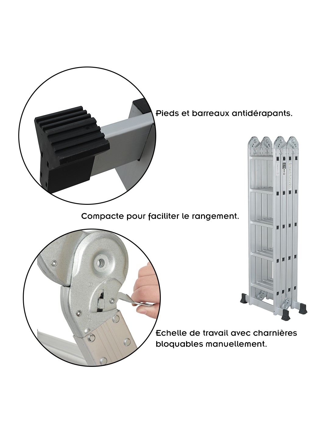 Elle est articulée en quatre parties et peut servir d'échelle, d'escabeau et de plateforme de travail.