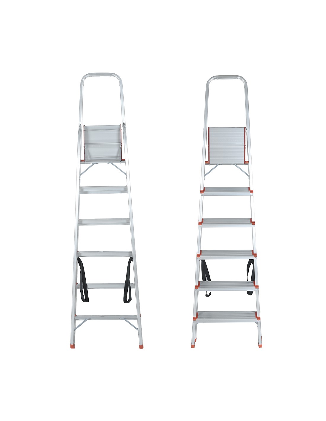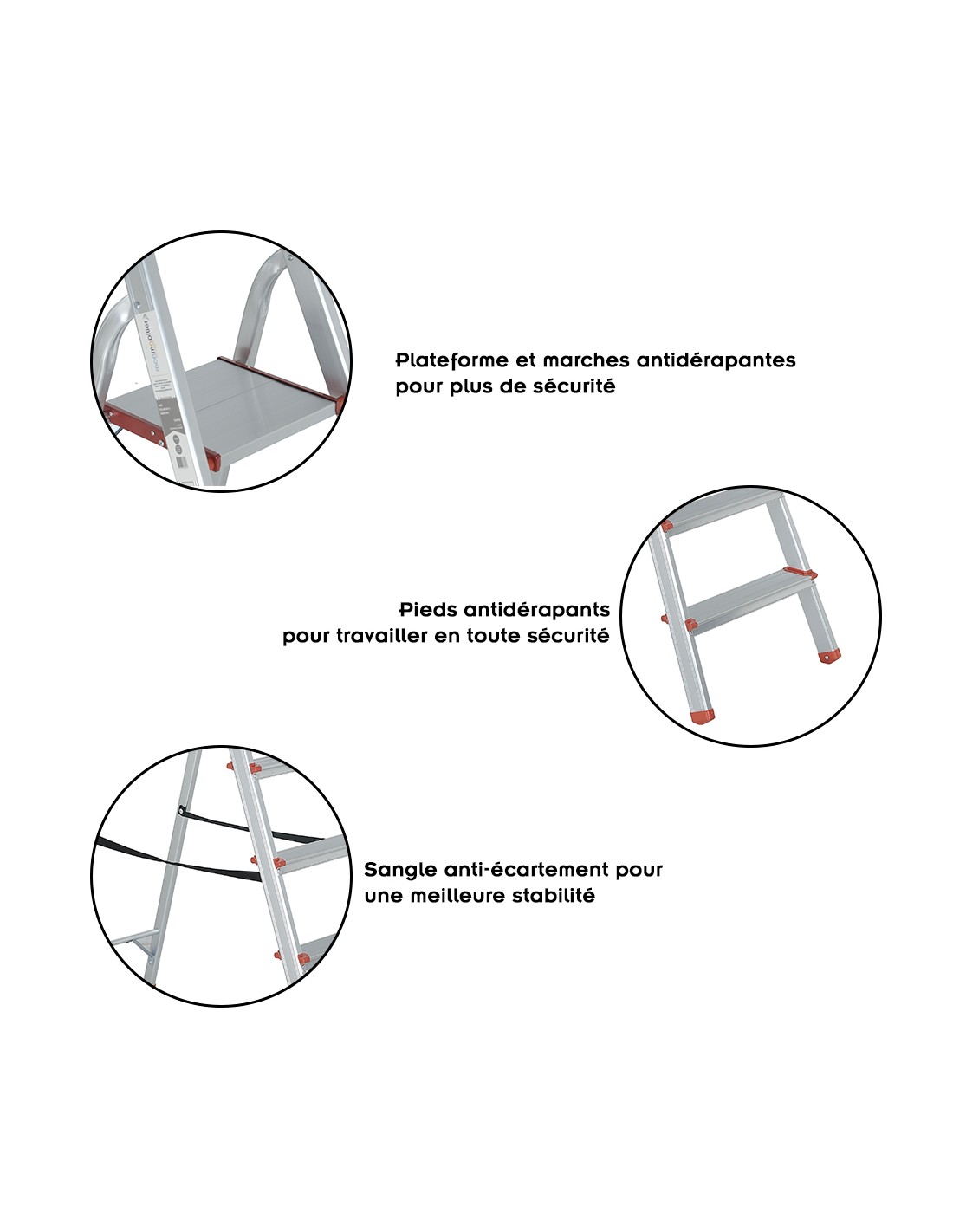 Sangles anti-écartement assurant un excellent maintien et une sécurité renforcée lorsque l’escabeau est ouvert.