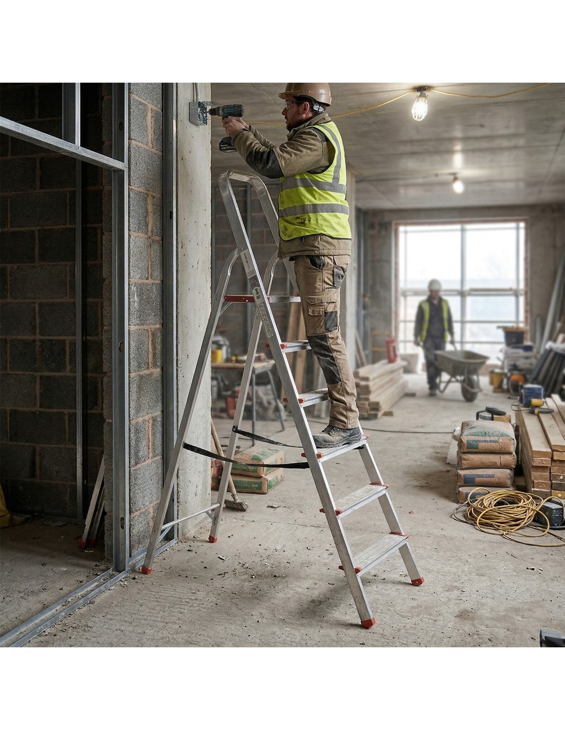 Escabeau pliable en aluminium, à la fois léger, robuste et facile à transporter.
