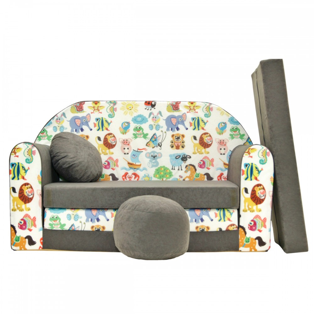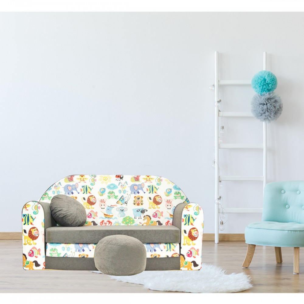 Canapé 2 places enfant modulable en lit avec 1 pouf, 1 coussin et 3 matelas (2 pour le divan et 3 pour le lit).