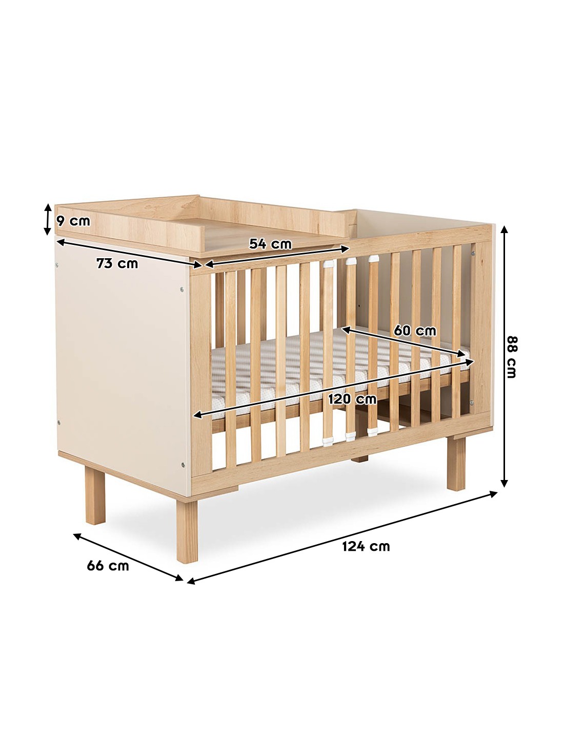 Conforme aux normes de sécurité Européennes. Dimensions du lit : L 124 x P 66 x H 88 cm.