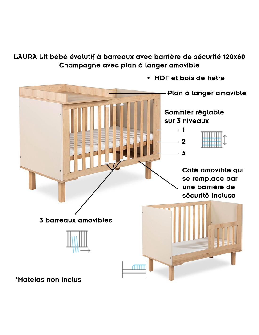 LAURA Lit bébé évolutif à barreaux avec barrière de sécurité 120x60 Champagne