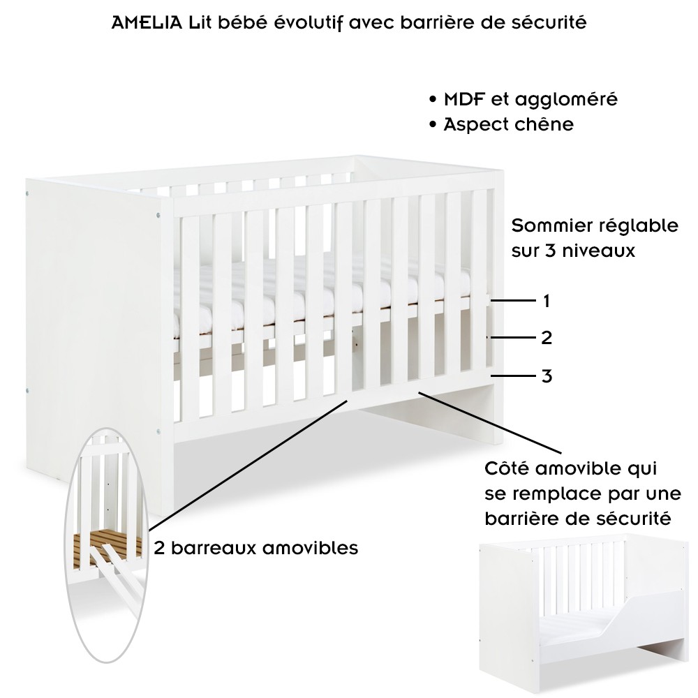 AMELIA II Lit bébé évolutif avec barrière de sécurité