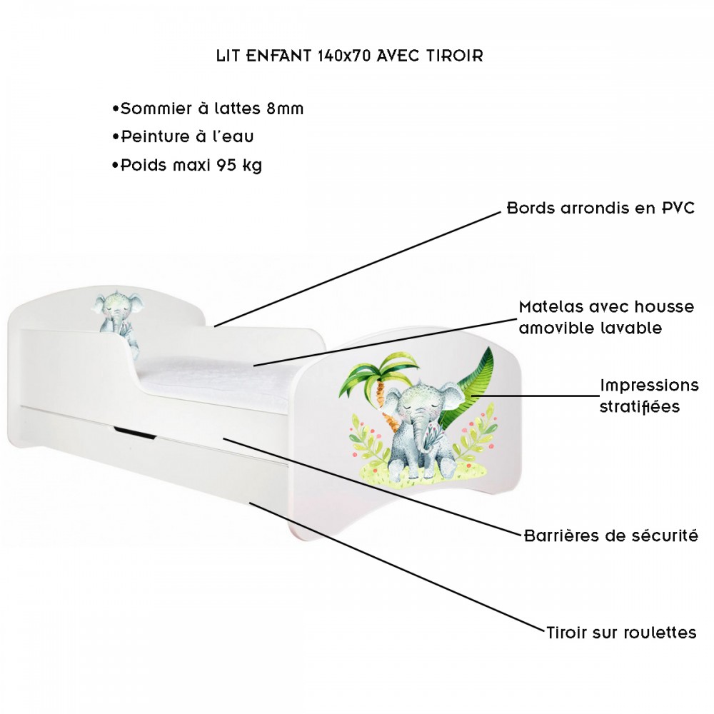 - Lit 140x70 cm enfant blanc avec motifs éléphant sur la tête et le pied de lit. Le sommier est à lattes en bois.