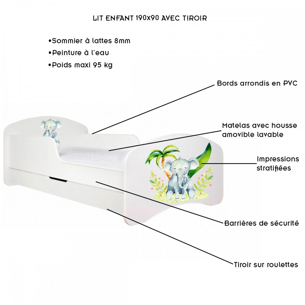 - Lit enfant 1 personne avec matelas. Le lit est décoré avec un motif pastel. Le lit est vendu avec ou sans tiroir.