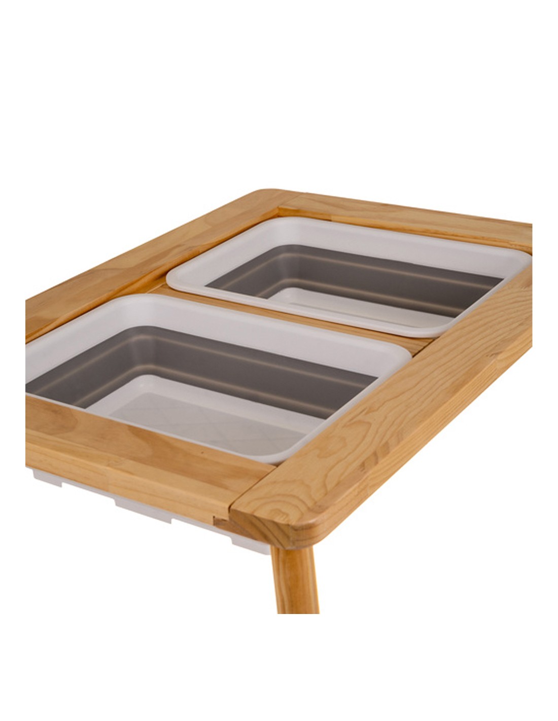 Cette table sensorielle est composée de deux bacs amovibles et rétractables en plastique recouverts par deux plateaux double face. Elle peut être utilisée comme bac à sable, table à eau, bacs de rangement, bacs à blocs de construction, pour dessiner...