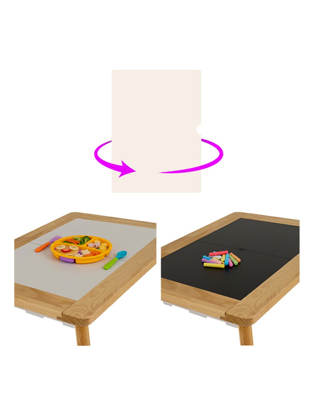 La face noire des plateaux double face est parfaite pour les craies. Tous les éléments de cette table sont faciles à nettoyer.