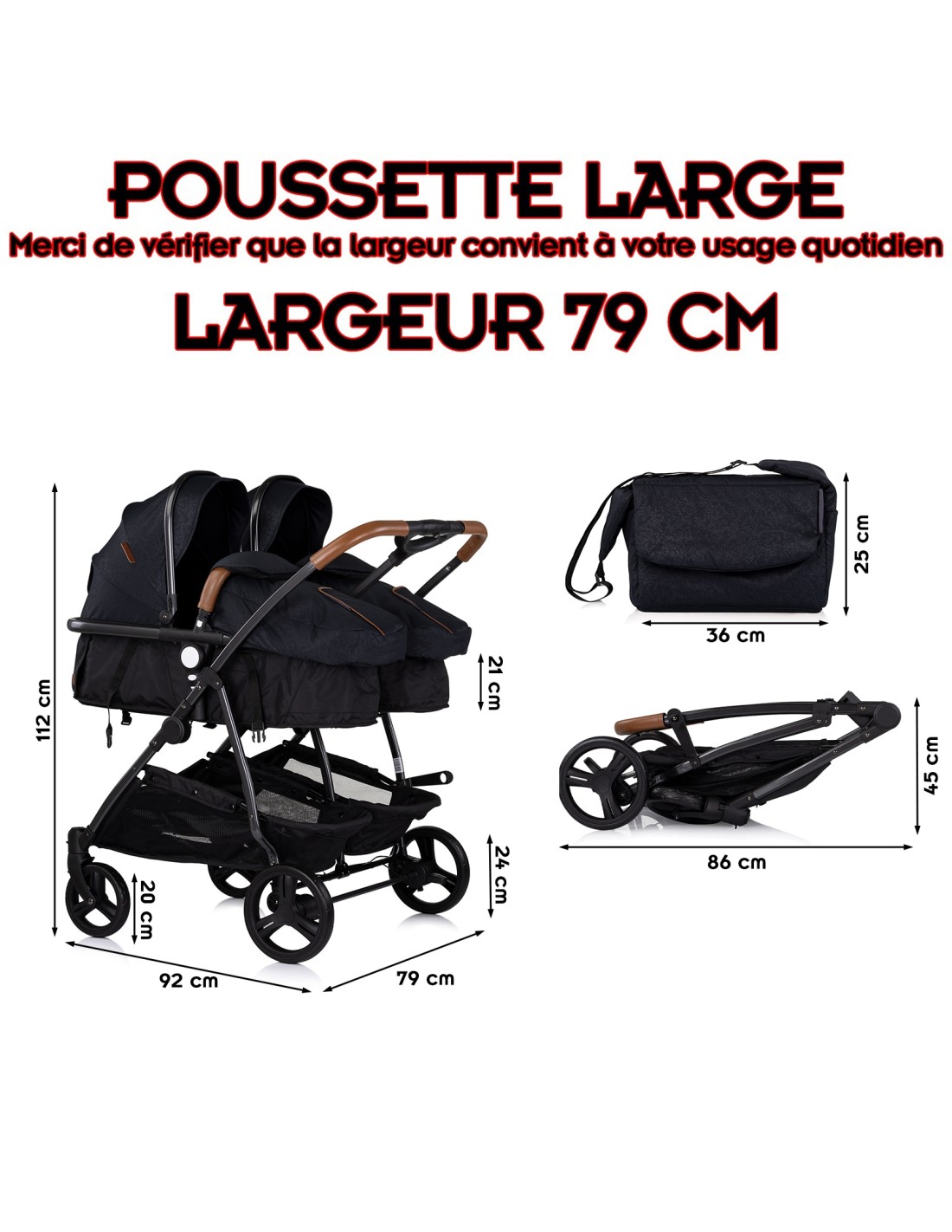ATTENTION : CETTE POUSSETTE EST LARGE (LARGEUR 79 cm). MERCI DE VÉRIFIER QUE CELA CORRESPOND À VOTRE UTILISATION QUOTIDIENNE (PORTES, TRANSPORTS...)