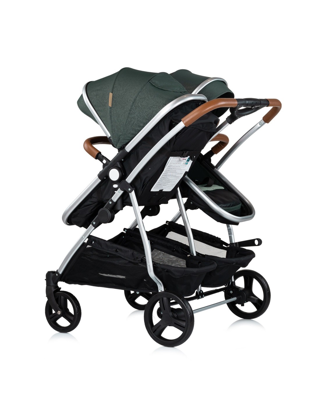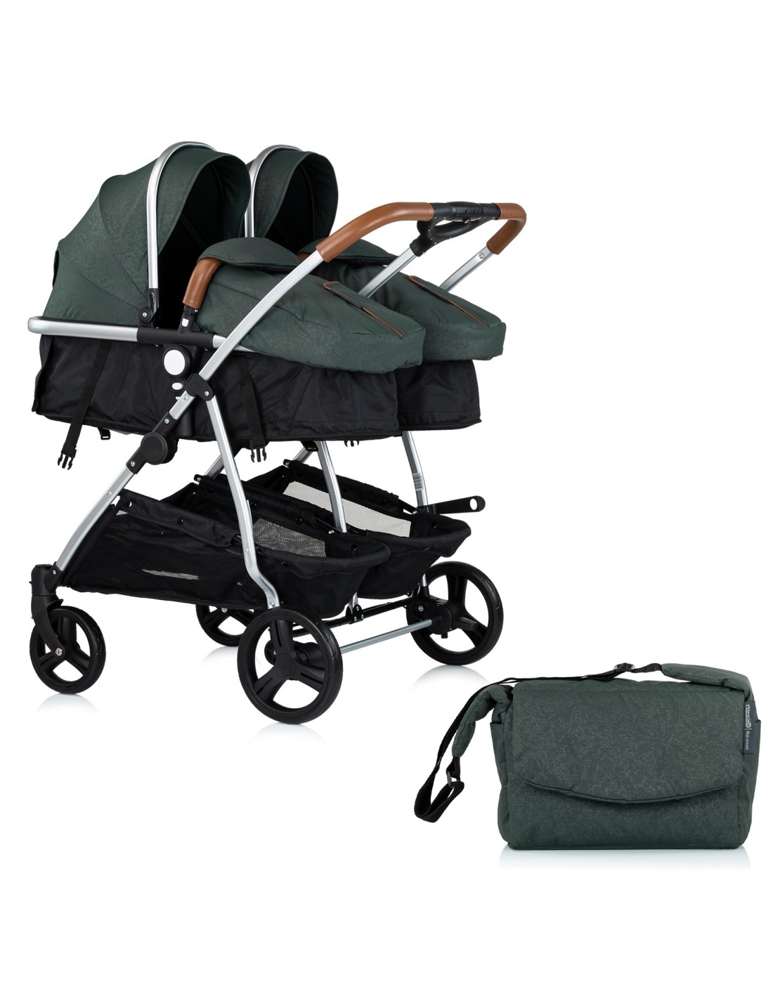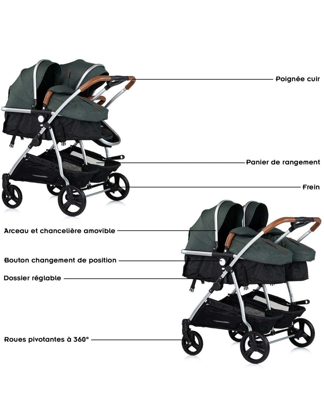 Nacelle inclinable en assise sur 3 positions. Chancelières et arceaux de sécurité amovibles. 2 paniers de rangement.