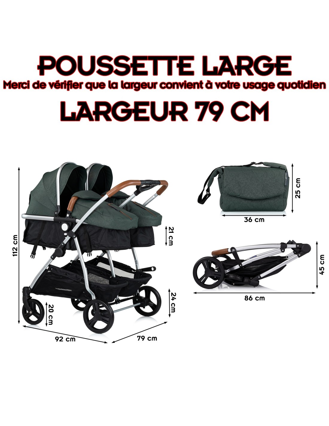 ATTENTION : CETTE POUSSETTE EST LARGE (LARGEUR 79 cm). MERCI DE VÉRIFIER QUE CELA CORRESPOND À VOTRE UTILISATION QUOTIDIENNE (PORTES, TRANSPORTS...)