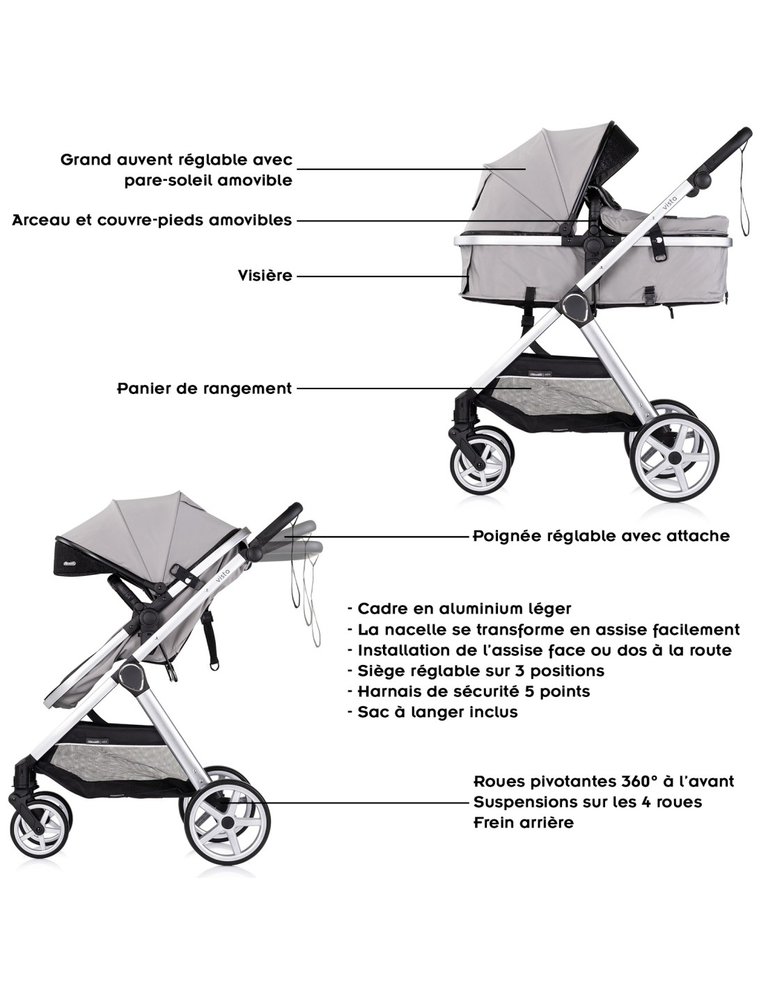 VISTA Poussette combinée jusqu'à 22 kg nacelle souple + assise classique