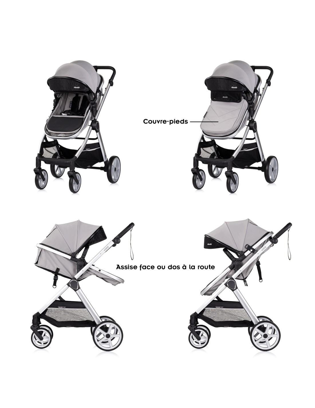 Auvent rétractable avec pare-soleil intégré + arceau + chancelière rembourrée amovibles.