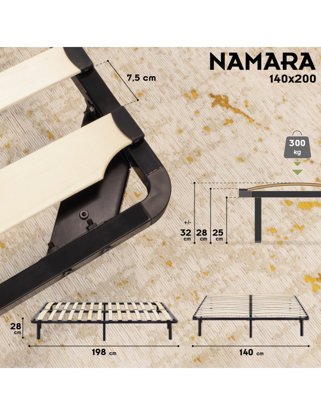 NAMARA Sommier à lattes robuste avec pieds en acier - Montage facile